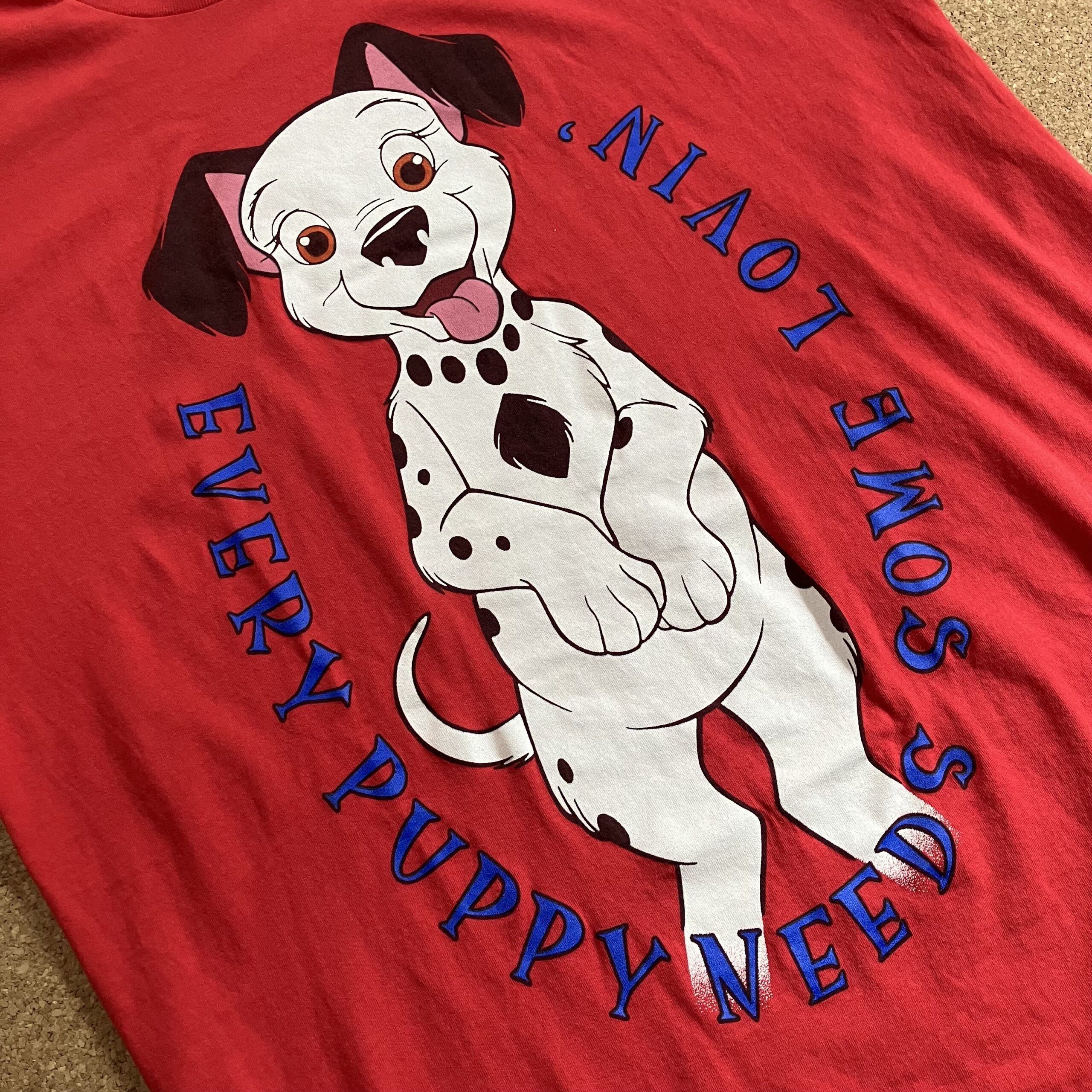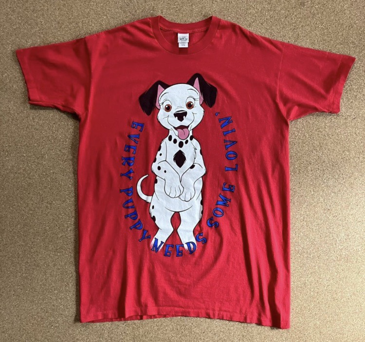 赤いボディに対して白×黒のコントラストがはっきり出ていて、視認性がすごく高いんですよね。周囲には「EVERY PUPPY NEEDS SOME LOVIN’」のメッセージが円状に入っていて、90年代らしいポップな構成になっています。発色もまだまだしっかりしていて、古着としての状態も良好です。