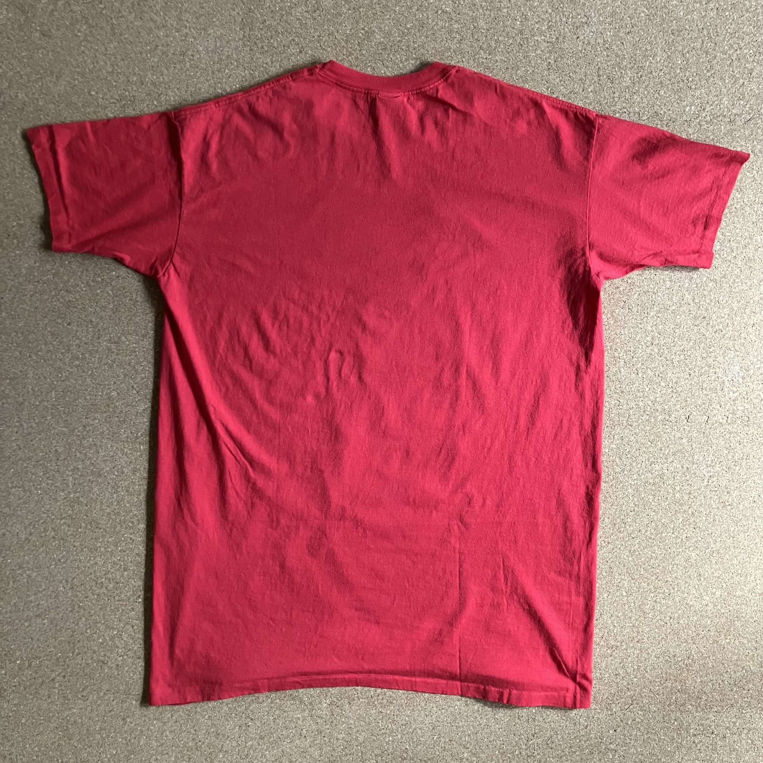 赤いボディに対して白×黒のコントラストがはっきり出ていて、視認性がすごく高いんですよね。周囲には「EVERY PUPPY NEEDS SOME LOVIN’」のメッセージが円状に入っていて、90年代らしいポップな構成になっています。発色もまだまだしっかりしていて、古着としての状態も良好です。