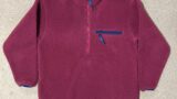 特定したのはL.L.Bean(エルエルビーン)のヴィンテージ「ハーフジップ ボアフリース プルオーバー」です。カラーはバーガンディ(ワインレッド)で、胸元のハーフジップと裾のドローコードが特徴的。首元から胸にかけてのネイビーの切り替えがアクセントになっていて、遠目にはバーガンディ一色に見えるけれど、近寄るとツートンのディテールが効いているタイプですね。